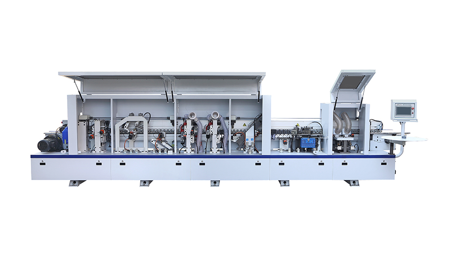 涂膠壓貼機(jī)構(gòu)通過(guò)涂膠軸對(duì)板材上膠,將板材與封邊帶粘接牢固均勻預(yù)銑機(jī)構(gòu)使封邊條與板材貼合更緊密,整體性和美觀度更佳前后齊頭機(jī)構(gòu)將工件首尾封邊帶切斷保證切斷面平整光滑粗修、精修機(jī)構(gòu)修去加工板材封邊條多余的封邊材料,保證修邊板材上下部分的平整光滑;